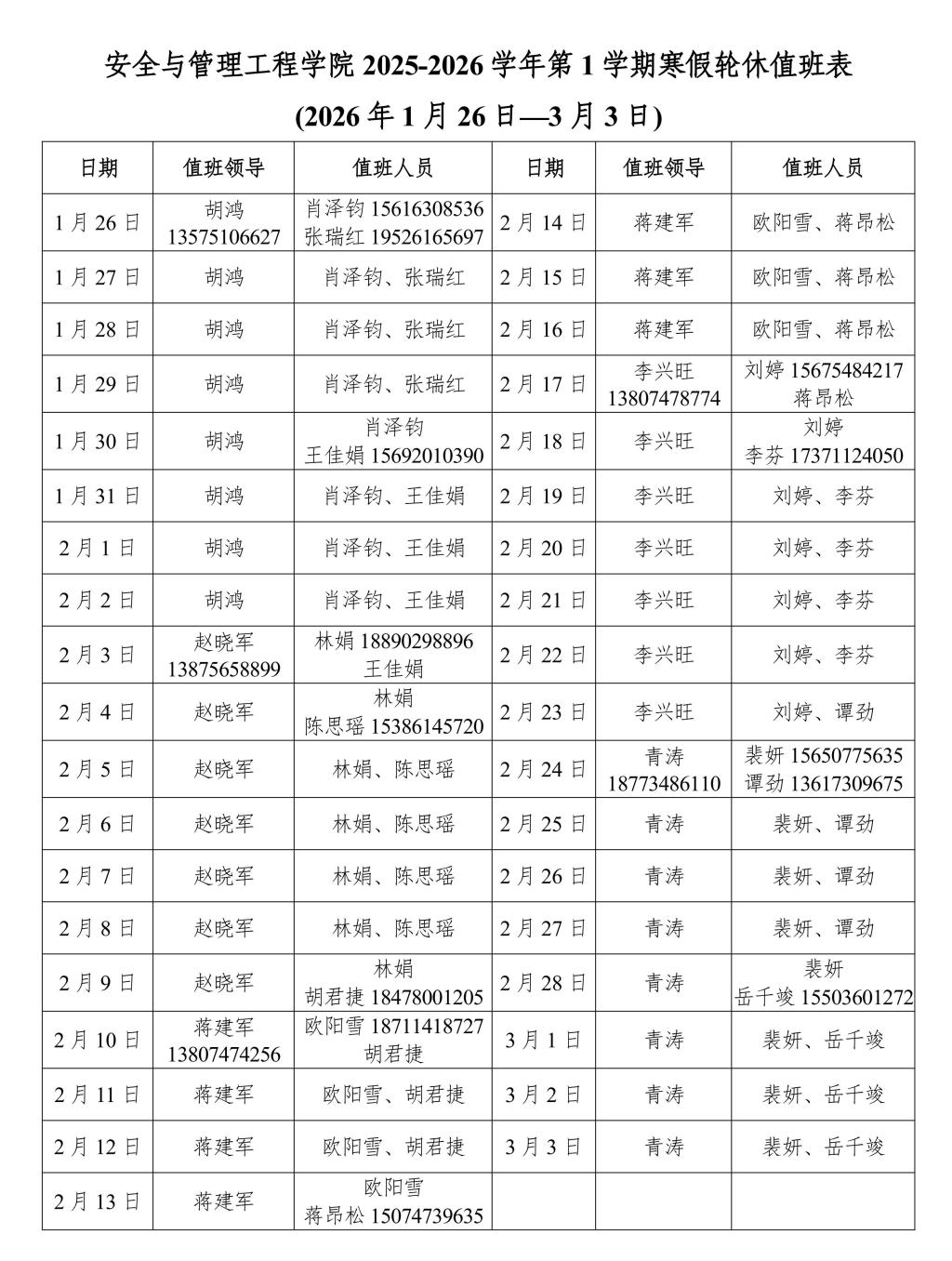 安全与管理工程学院2025-2026学年第1学期寒假轮休值班表