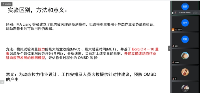 会议开始,刘洺宇同学汇报《基于能量分析的装配作业疲劳改善研究》文献阅读情况,讲述了该论文的主要内容并分享了自己对此论文的理解。随后,该项目组成员对此进行了提问,刘洺宇同学对其问题一一回答,最后,易灿南老师对刘洺宇同学的汇报及问答进行点评,引导同学们关注论文关键核心点。