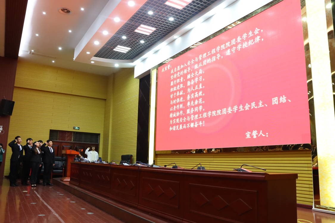 黄宏格宣读了《关于安全与管理工程学院第十四届团委学生会干部的任命决定》。傅娜为新一届学院团委学生副书记、学生会主席团成员颁发聘书。全体辅导员为新一届学生干部颁发聘书。