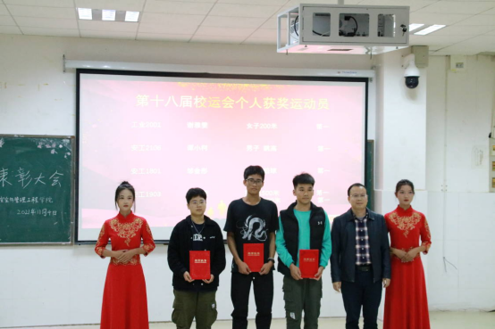 黄宏格宣读了《安全与管理工程学院关于表彰第十八届校运会先进集体和先进个人的决定》。与会嘉宾分别为获奖运动员、优秀运动员、国旗队优秀教官、方阵队优秀队员、优秀工作者以及优秀班级代表颁奖并合影留念。