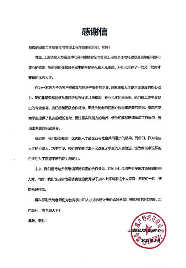 38,上海链家人力资源中心向304永利集团官网安全与管理工程学院发来感谢信。信中,上海链家对安工学院教师的辛勤付出表示诚挚谢意。学院输送的毕业生凭借扎实专业知识、强烈责任感和出色团队协作能力,在岗位上迅速崭露头角,展现出极高的职业素养,受到一致好评