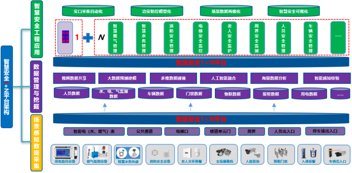 智慧安全1+N平台是一个开放架构体系,“1”是以电气火灾智能运维管控系统为依托,建立严格、完善的智慧安全数据平台,承接数据管理与分析, 而“N”是根据政府、市民、单位和企业四大主体需求,延深的多个智慧安全管理服务。通过物联科技手段,将电气安全、燃气安全、消防安全、周界安全、电梯安全、资产安全、车辆安全、人员异常行为识别等安全管理系统融合在一个信息化安全管理平台。用大平台提供的安全隐患信息智能自动化推送功能,能有效实时的将安全隐患精准分解,配合各个相关系统专业管理人员及时消除安全隐患,实现智慧管控安全的目的。