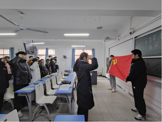 随后,发展对象和全体党员进行入党宣誓,他们高亢激昂,声音久久回荡在教室里,真正展现出了对党的崇高敬意。