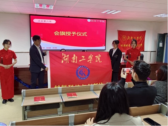 熊鑫为第一任会长乔婧授会旗,乔婧作述职报告。熊鑫寄语会员积极参与协会的各项活动,为协会的发展贡献出一份力量,融入协会的大家庭之中,努力让材料科技与创新协会成为一个有凝聚力、有向心力的优秀协会!