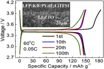 全固态锂电池比现有锂离子电池具有更高的能量密度和安全性,能够满足电动汽车和大规模储能的发展需求,但是全固态锂电池还存在固体电解质离子电导率低和固体电极/电解质界面阻抗大的难题。本论文采用元素掺杂和热压烧结工艺制备高致密高锂离子电导率的石榴石型固体电解质Li6.4La3Zr1.4Ta0.6O12(LLZTO),通过设计由LiFePO4活性材料、导电碳、高浓度锂盐的聚合电解质组成的复合正极,在LiFePO4复合正极内部同时构筑了快速的锂离子和电子传输通道,显著减小了LiFePO4正极/固体电解质固固界面阻抗,使得LiFePO4复合正极|LLZTO|Li全固态锂电池在60 ℃和100 ℃获得优异的电化学性能,推动了基于石榴石型固体电解质的固态锂电池的应用。