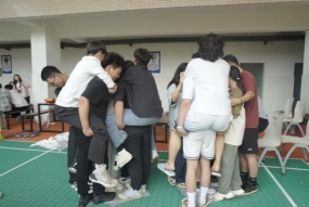 讲座结束后,心理专家谢玲带领40余名同学在材化楼3楼阳台开展团体辅导活动。“你喂我吃”活动要求遮住眼睛给队友递吃香蕉,“同舟共济”活动把一张布当成大海的一条船,每组团体成员必须同时站在船上,一个也不能少,并持续将布面积减半。两个活动充分地培养了学生心、脑、手的默契,让学生感受到了团队合作的力量。