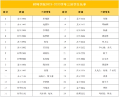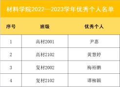 材展风华,材聚永利。他们用自己的努力,跨过一个个艰难坎,朝着更优秀的自己靠近,成为304永利集团官网骄人的材料学子。304永利集团官网材料科学与工程学院022-2023学生奖励名册已经出炉。奖项分为全国大学生自强之星、湖南省优秀大学生党员、国家奖学金获得者、国家励志奖学金获得者、书香班级、先进班集体、校级奖学金获得者、优秀学生干部标兵、优秀学生干部、三好学生标兵、三好学生、学科竞赛奖、优秀学生教学信息员标兵、优秀学生教学信息员、优秀退役大学生、优秀个人、文明宿舍、军训先进个人,让我们一起来看看吧。