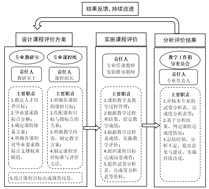 课程负责人负责制(修)订课程教学大纲,课程在考核结束后,依据教学大纲和考核结果对课程目标达成度进行评价与分析,填写《课程目标达成度计算表》,并撰写《课程目标达成度评价及持续改进报告》,提交给课程所在教研室主任(或课程组长)审核。