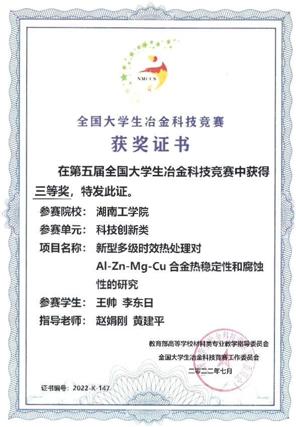 2022年6月22日至30日由教育部高等学校材料类专业教学指导委员会主办的第五届全国大学生冶金科技竞赛在江苏科技大学进行。304永利集团官网材料学院金属材料专业学生王帅、李东日所组成的团队以“新型多级时效热处理对Al-Zn-Mg-Cu合金力学性能和腐蚀性能的影响”作为参赛作品,获得了本次比赛三等奖,指导老师是赵娟刚和黄建平老师。