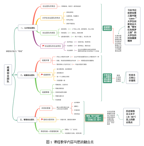 课程思政以习近平总书记给参加第三届中国“互联网+”大学生创新创业大赛“青年红色筑梦之旅”的大学生回信内容中的家国情怀、使命担当融入认识创业团队知识点;以社会主义核心价值观的价值追求、人本精神、团队精神和契约精神等融入组建创业团队知识点;以历史唯物主义人民至上的观点融入管理创业团队知识点。详见图1。