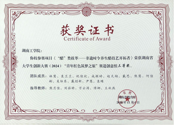 醋类萃团队致力于传承非物质文化遗产—桃江瞿峰米醋传统制作技艺,助力桃江时令醋产业发展。桃江时令醋是全球唯一时令生料酿制醋,严格遵循自然时令之道,与二十四节气相依存。目前团队成员及指导老师分别成为瞿峰时令醋制作技艺第30、29代传承人,并联合市级非遗传承人、技能大师熊万峰共同“醋进”时令醋的发展。团队从工艺创新、产品创新、延展创新三方面着手,根据药食同源理念,联合老中医研发四款古方时令养生醋;首创“千里时令醋丸”;多方联合研发米醋生物多肽面膜和酸元素喷剂等衍生产品。