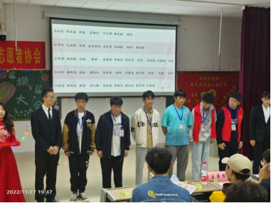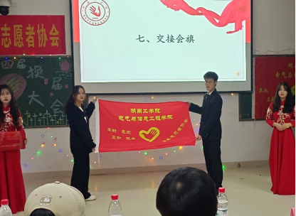 之后播放了其他学院青协、各大高校青协对电信青协的祝福视频,以及电信青协的活动介绍视频,让大家都感受到青协之家的温馨与幸福,感受到电信青协的力量与精神,充分诠释了志愿者这一称号的重要意义,以及所要承担的责任与义务。在美妙的歌声《这世界有那么多人》后,阳柯老师宣布本届新任会长以及各部门部长、副部长等人员,并为他们颁发聘书。随后进行了会旗交接仪式,新一任的接力棒正式交到新一届成员手中。