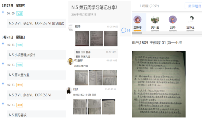 2、互动形式多样化。雨课堂讨论区进行学习笔记分享与评优引导学生养成良好的学习习惯;客观题实现预习测试、章节测试、课题测试难度递增检查知识点的掌握情况;小组分工协作以主观题进行程序设计督促学生增强综合能力;小组项目展示与相互点评以不同的角色参与课堂促进学生的学习兴趣。