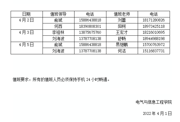 2022年电气与信息工程学院清明节期间值班安排表