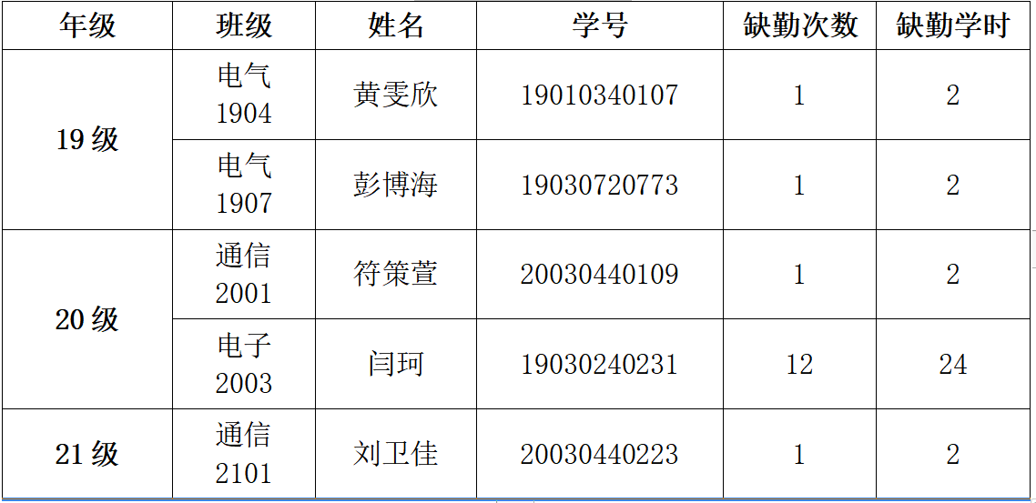 电气与信息工程学院 2021-2022-1学期第十周课堂考勤表情况通报