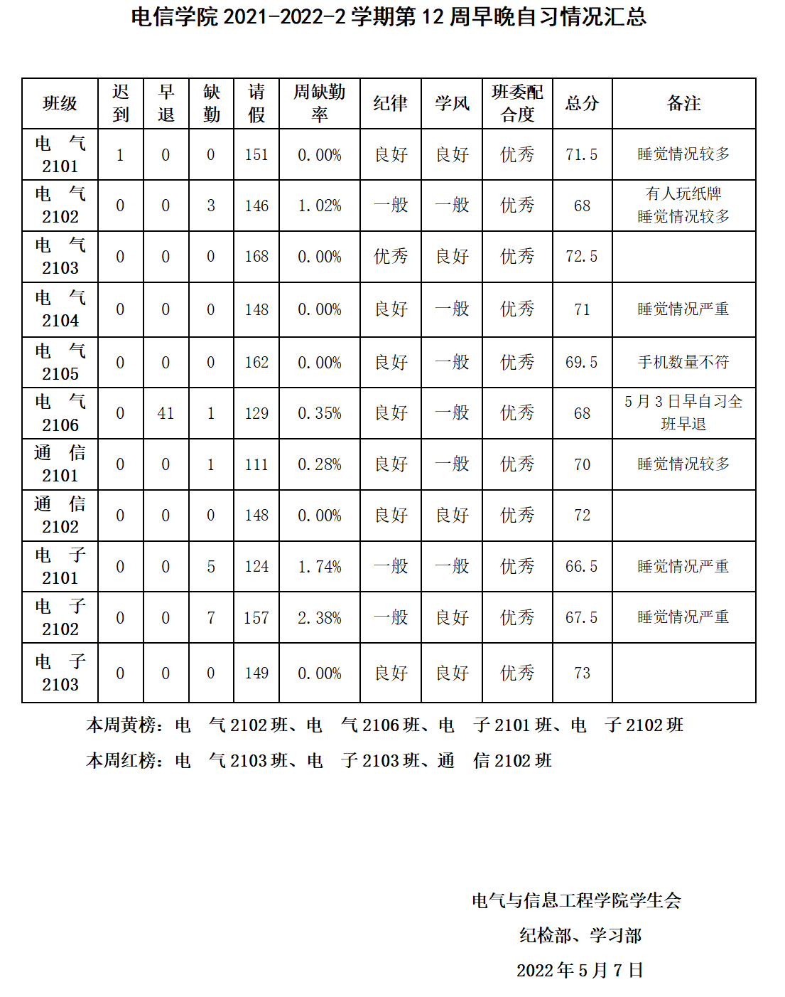 电信学院2021-2022-2学期第12周早晚自习情况汇总