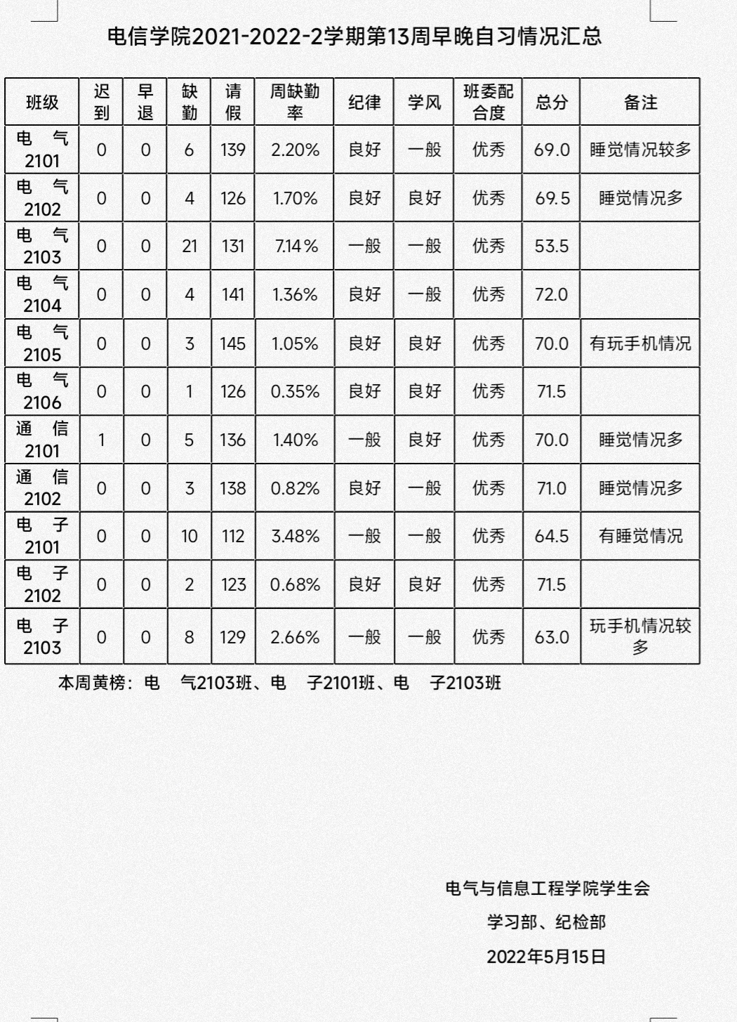 电信学院2021-2022-2学期第13周早晚自习情况汇总