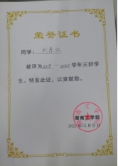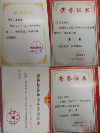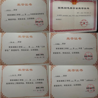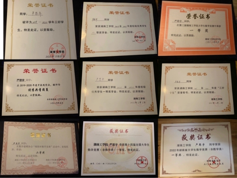 在校期间曾获国家励志奖学金、湖南省大学生数学竞赛三等奖、校级数学竞赛二等奖、“华教杯”全国大学生数学竞赛初赛三等奖、校级二等奖学金和三等奖学金、校级优秀共青团员。