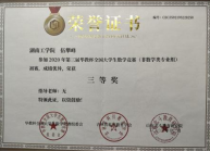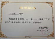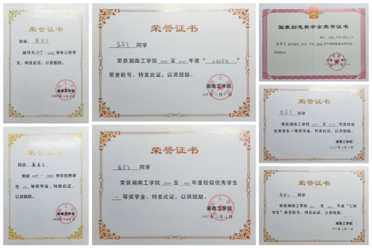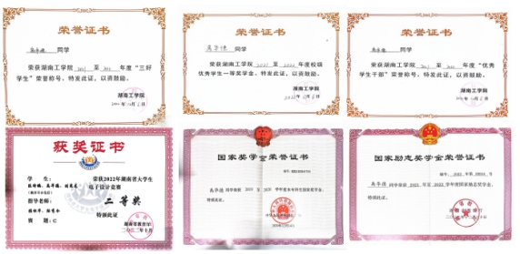 在校期间曾获国家励志奖学金、湖南省大学生电子设计竞赛三等奖、校级一等奖学金、校级三好学生、校级优秀共青团员、校“互联网+”创新创业竞赛二等奖、校“挑战杯”创业计划竞赛二等奖、校“圆融杯”电子设计竞赛二等奖等荣誉;曾获湖南省大学生创新创业项目立项,曾以第一作者在国家级期刊发表学术论文一篇,以第一著作权人获软件著作权一项,积极参加暑期“三下乡”大学生社会实践活动。