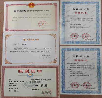 在校期间荣获国家励志奖学金、校级一等奖学金,第十三届“蓝桥杯全国软件和信息技术专业人才大赛”单片机设计与开发大学组省赛一等奖、国赛二等奖,湖南省大学生电子设计竞赛一等奖。