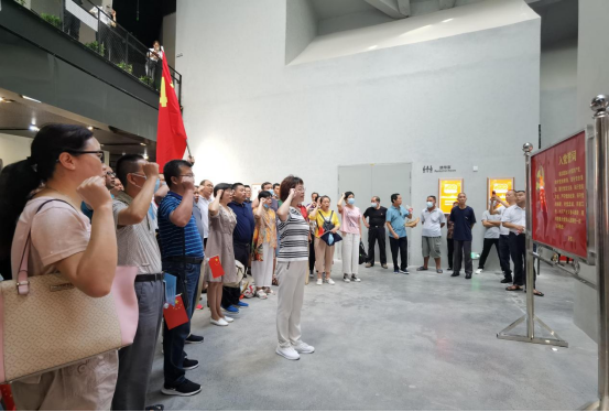 在水口山工人运动纪念馆,全体党员面向鲜红的党旗重温了入党誓词,在铿锵誓词中牢记初心使命,永葆忠诚本色。