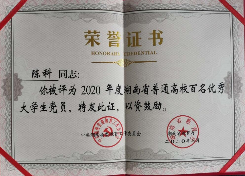 近日,中共湖南省委教育工作委员会印发《关于表彰2020年度全省普通高校百名优秀大学生党员的通报》(湘教工委通〔2020〕13号),对全省各高校100名优秀大学生党员进行通报表彰。永利电气与信息工程学院电气工程及其自动化1607班陈科同学荣获“湖南省普通高校百名优秀大学生党员”荣誉称号。
