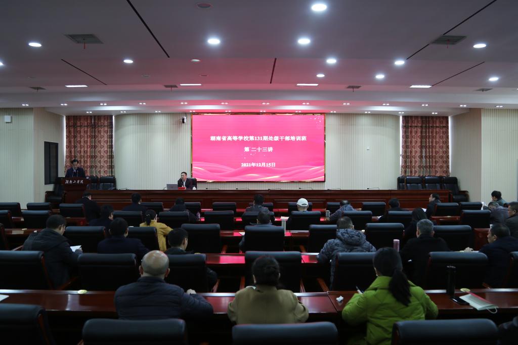 12月15日下午,湖南省高等学校第131期处级干部培训班举行第二十三讲,由湖南省教育厅党组成员、总督学郭建国主讲。讲课由校党委书记宋克慧主持。