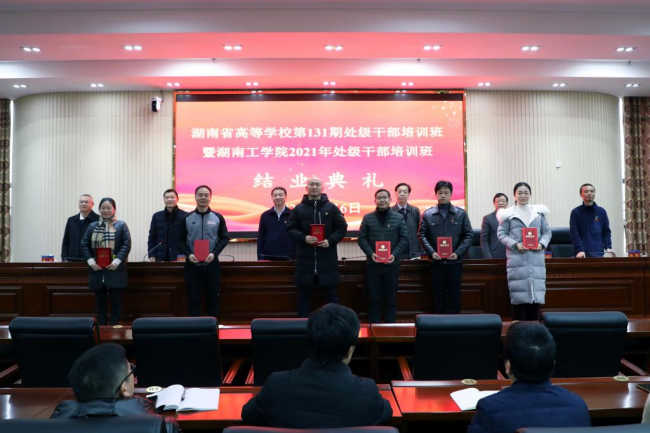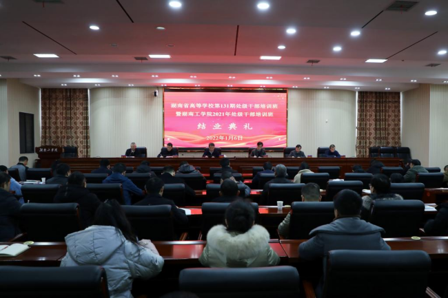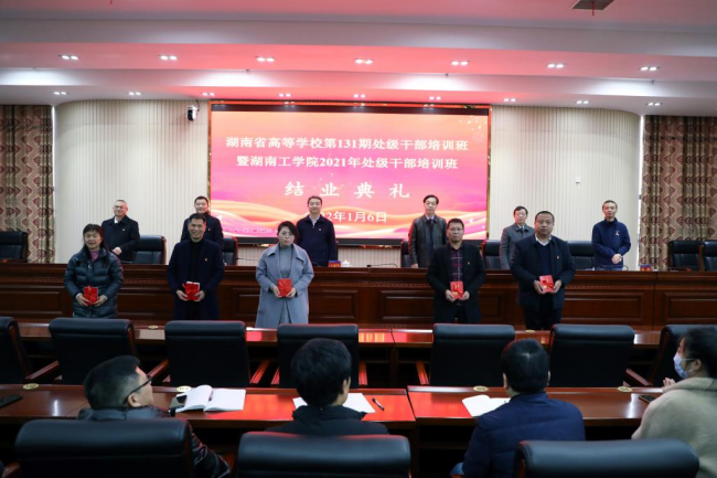1月6日下午,湖南省高等学校第131期处级干部培训班暨304永利集团官网处级干部培训班在学校教学大楼12楼报告厅举行结业典礼。省委教育工委副书记、省教育厅党组成员、省委教育工委党校校长王建华,省委教育工委党校常务副校长、省高校干部培训中心主任、书记刘国华,校党委书记宋克慧,校长曹执令,党委副书记张平,党委组织部常务副部长杨朗出席结业典礼。典礼由曹执令主持。
