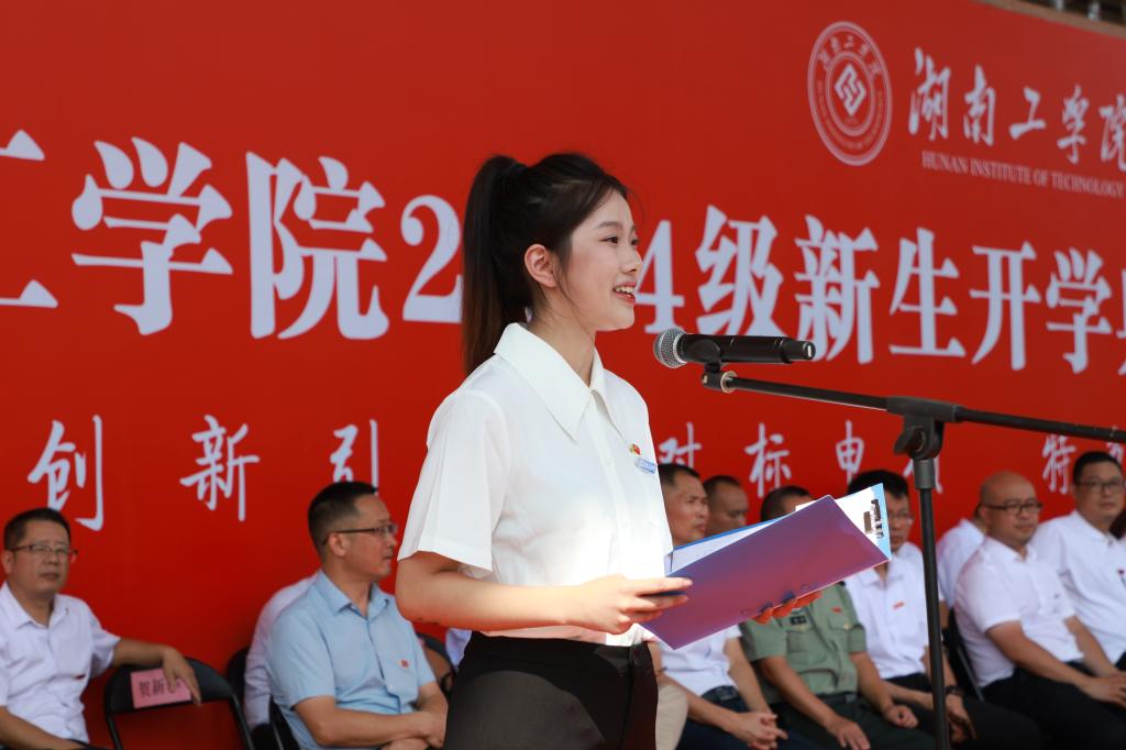 老生代表、工程2102班的林欣仪以亲身经历,分享了学习与实践的经验,鼓励新生们以“热爱、责任、努力”面对未来的大学生活。