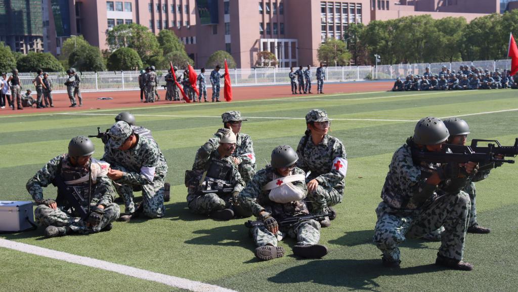 课目表演环节精彩纷呈。擒敌拳方阵以矫健的动作登场,拳风劲烈、气势如虹,每一招一式都透露着坚定的力量与过硬的技能;枪操表演队列整齐、动作精准,展示了完美的团队配合与作战智慧;匕首操方阵则以凌厉的动作诠释了刚强与不屈,充分展现了军训带来的意志力和纪律性。模拟战场上,战术方阵的学员们迅猛出击,精准执行任务,展示出卓越的军事技能与团队协作能力。战场救护环节中,学员们迅速而有序地进行伤员救护操作,充分体现了对生命的尊重与保护。