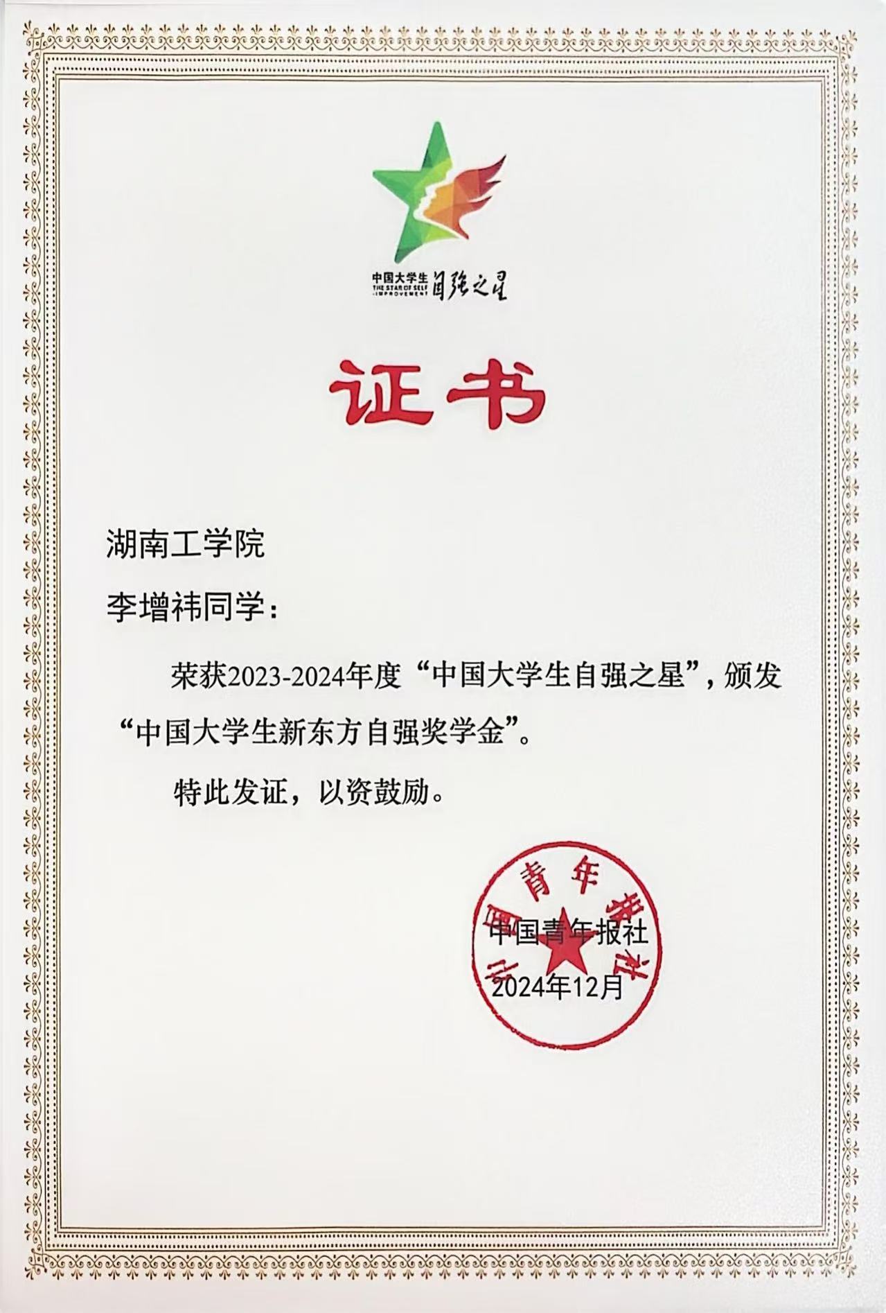 近日,2023-2024年度“中国大学生自强之星”奖学金推报活动的评选结果揭晓,永利李增祎同学获评2023-2024年度“中国大学生自强之星”,并获得“中国大学生新东方自强奖学金”。