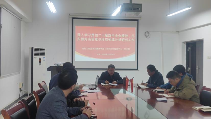 1028日,现代工程技术实践教学部(材料分析检测中心)党支部召开全体党员会议,专题学习贯彻党的二十届四中全会精神,深入分析研判2025年下半年意识形态工作。会议由党支部书记周立主持,全体党员参加。