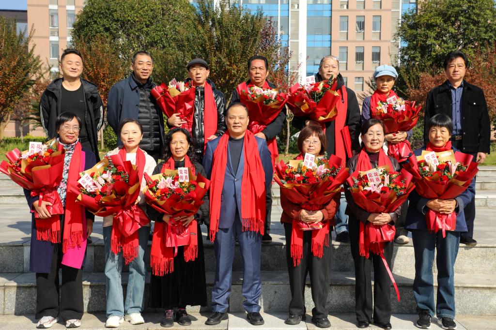 谢柯代表学校向荣退教职工们献上鲜花,并一同合影留念。