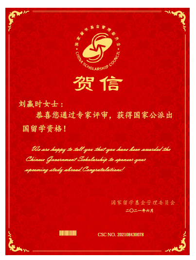 近日,国家留学基金管理委员会(CSC)发布通知,公布了“2021年国家公派高级研究学者、访问学者、博士后项目”(面上项目)录取结果,永利教师刘赢时获批该项目。(国际合作交流处)