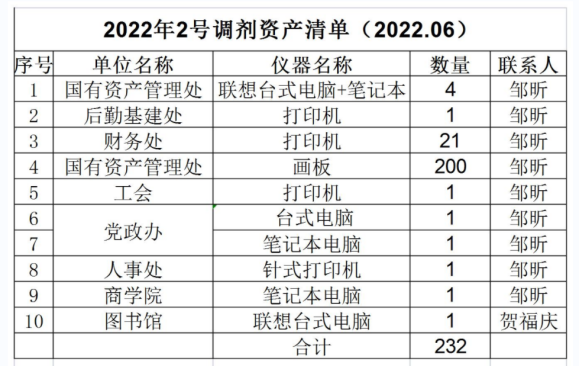 经过新一轮资产清查,根据《304永利集团官网资产管理办法》相关规定,本着节约办公的原则,现对相关部门资产进行校内调剂(详见资产清单)。请有意向的部门即日起与相关老师联系,现场查看设备,并到我处官网下载填写《304永利集团官网资产调剂申请表》办理调剂手续。本批校内资产调剂从即日起至7月7日截止,逾期将不予办理。