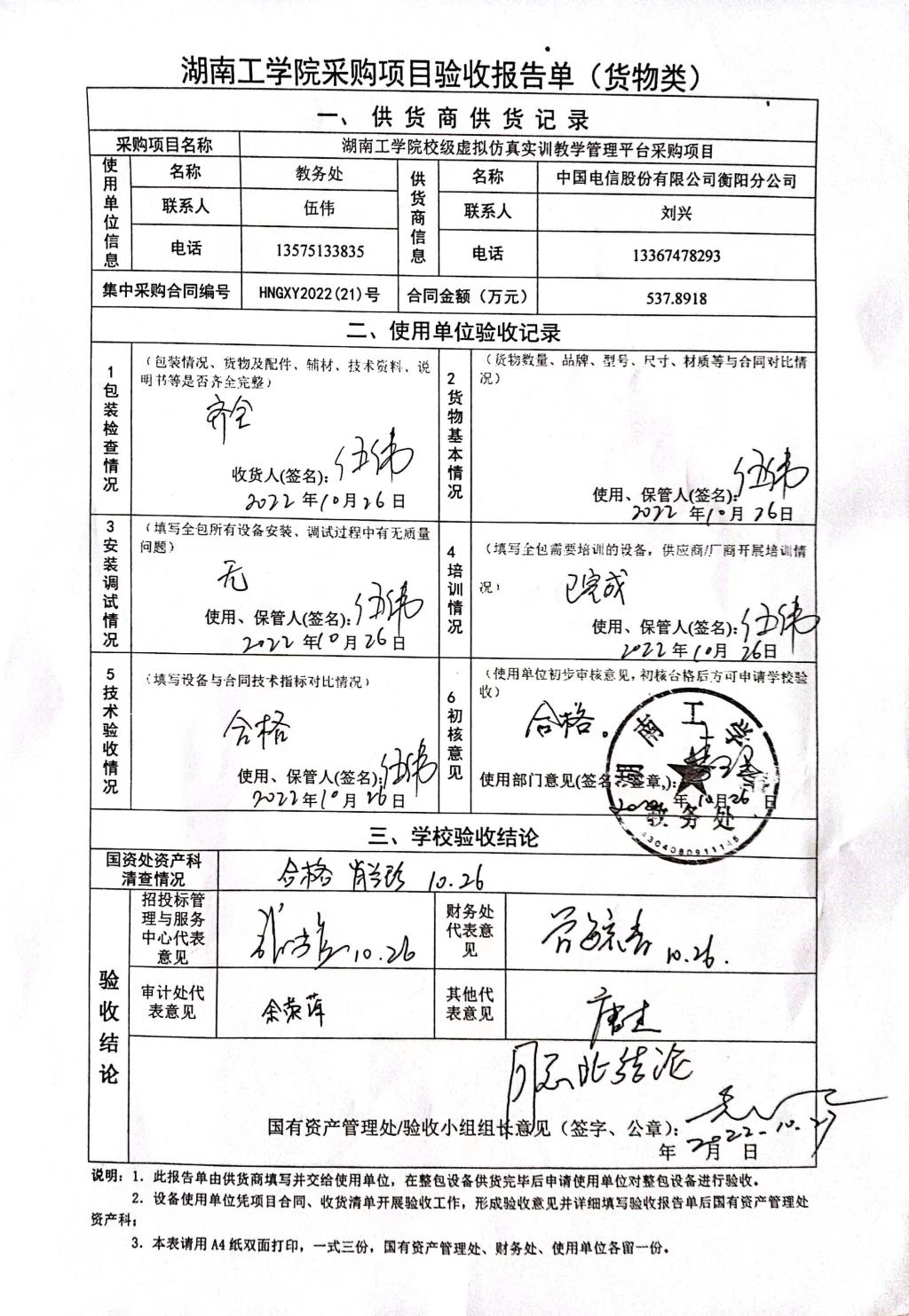 根据国有资产管理处对采购项目的验收安排,2022年10月26日国有资产管理处组织招投标管理与服务中心、审计处、财务处、网络信息中心、各使用部门以及供货商代表参加教务处采购项目《304永利集团官网校级虚拟仿真实训教学管理平台》进行现场验收。