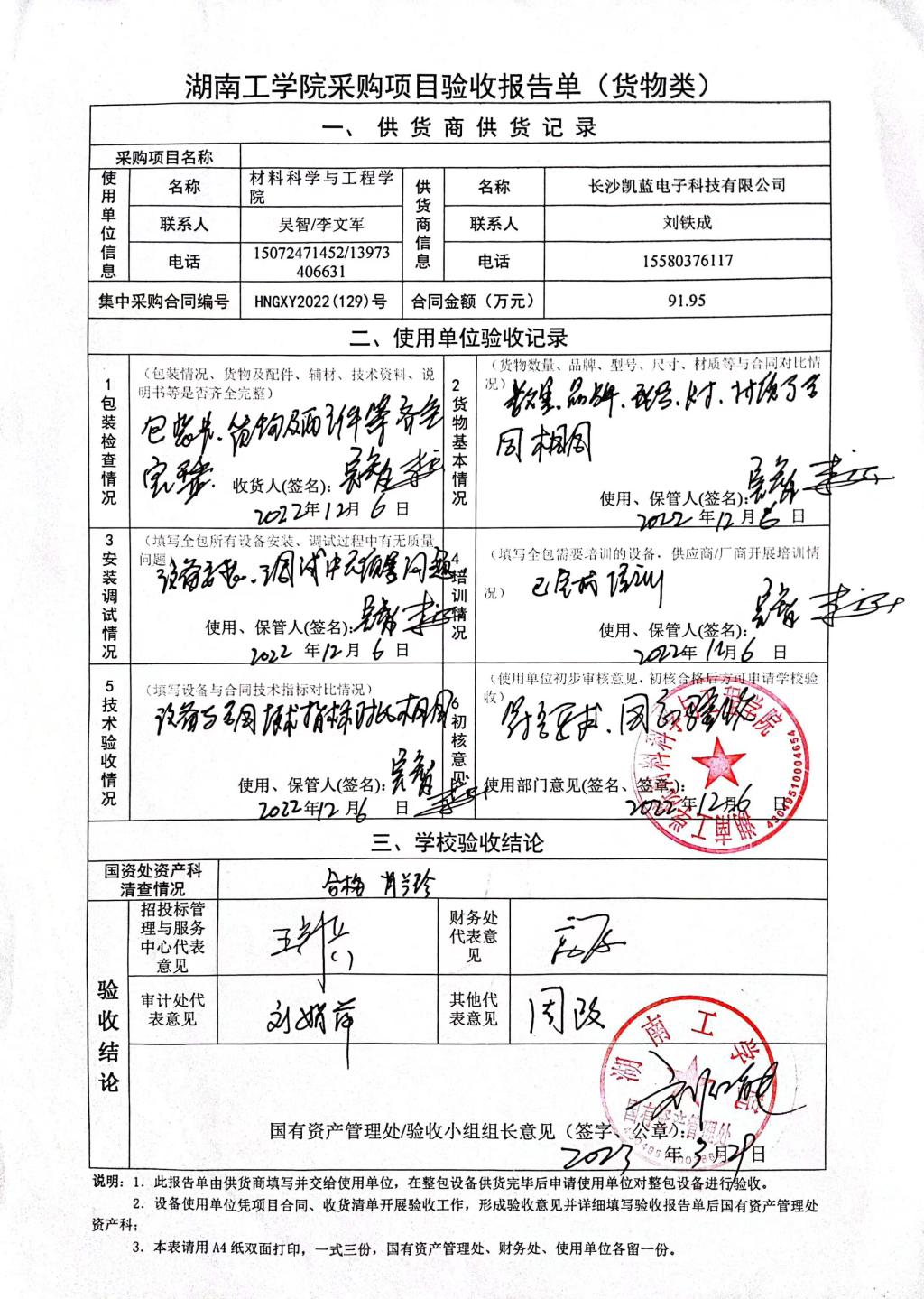 2023年3月关于HNGXY2022【129】号 购字2022【73】号采购项目验收情况公告