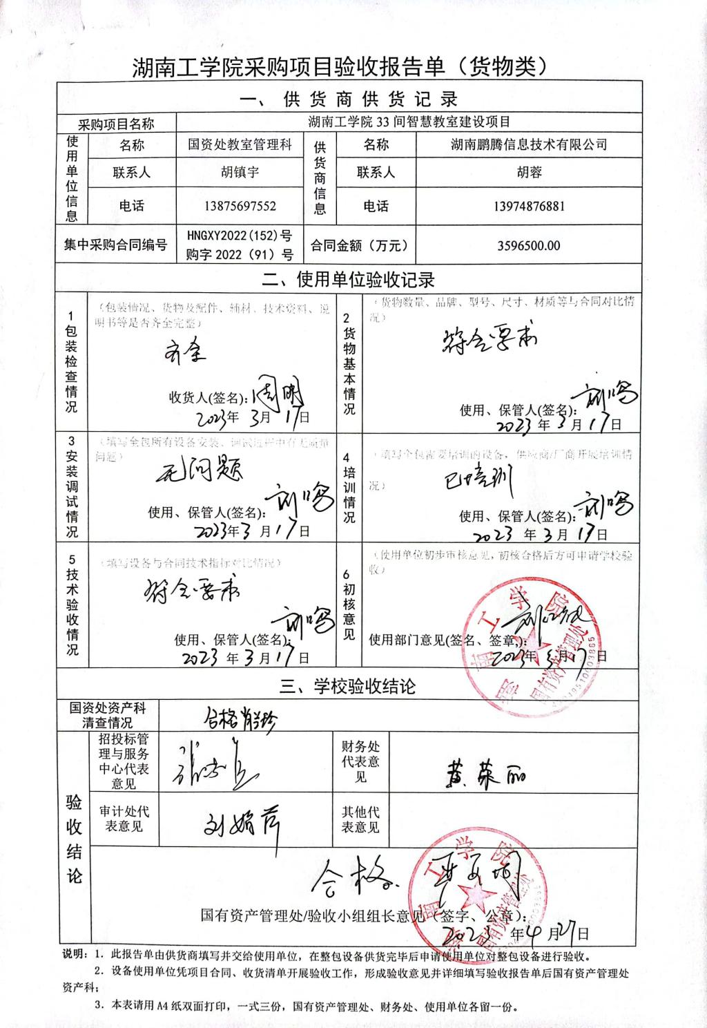 2023年4月关于HNGXY2022【152】号 购字2022【91】号采购项目验收情况公告