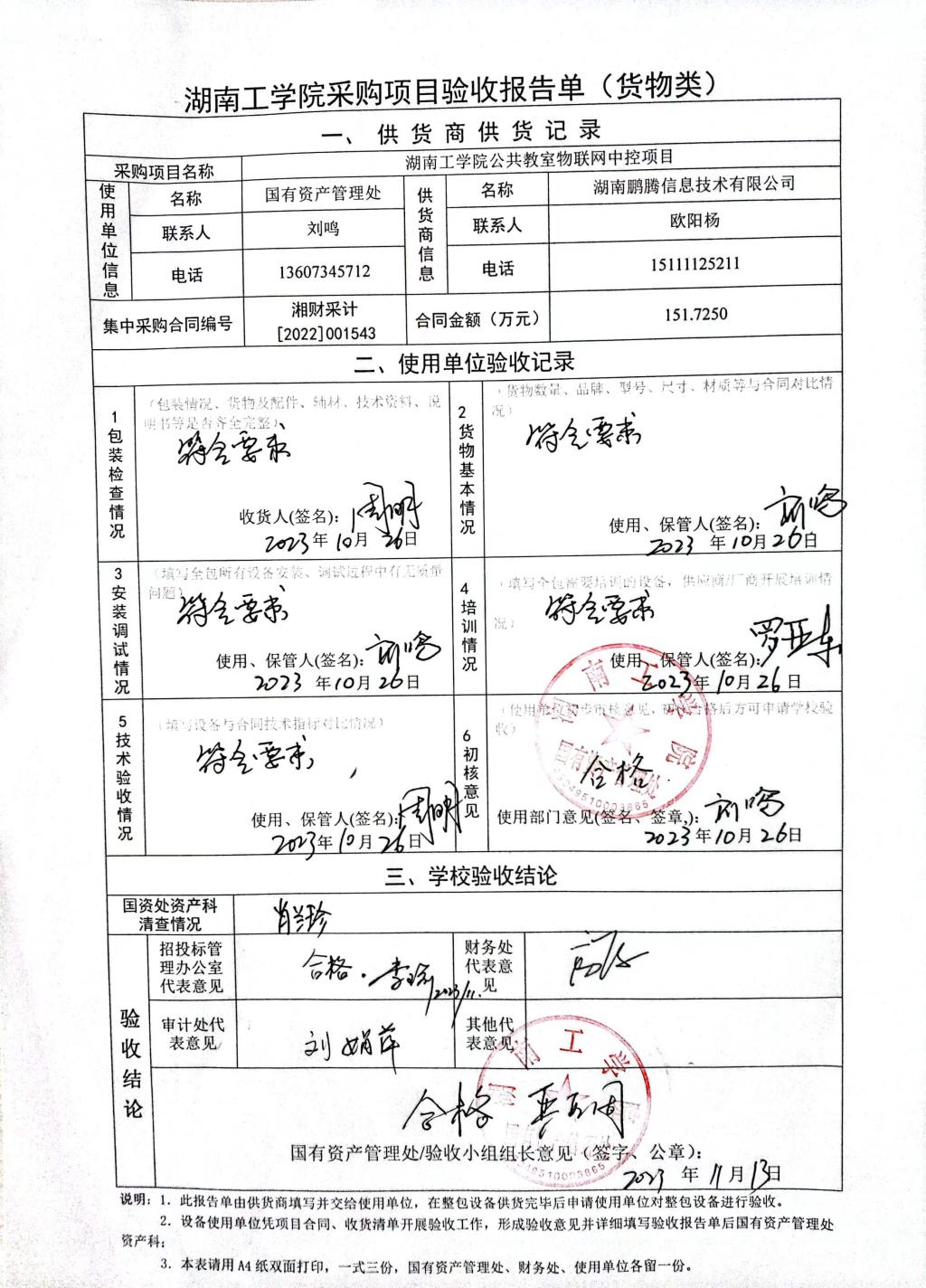 2023年9月关于湘财采计【2022】001543号项目验收情况公告