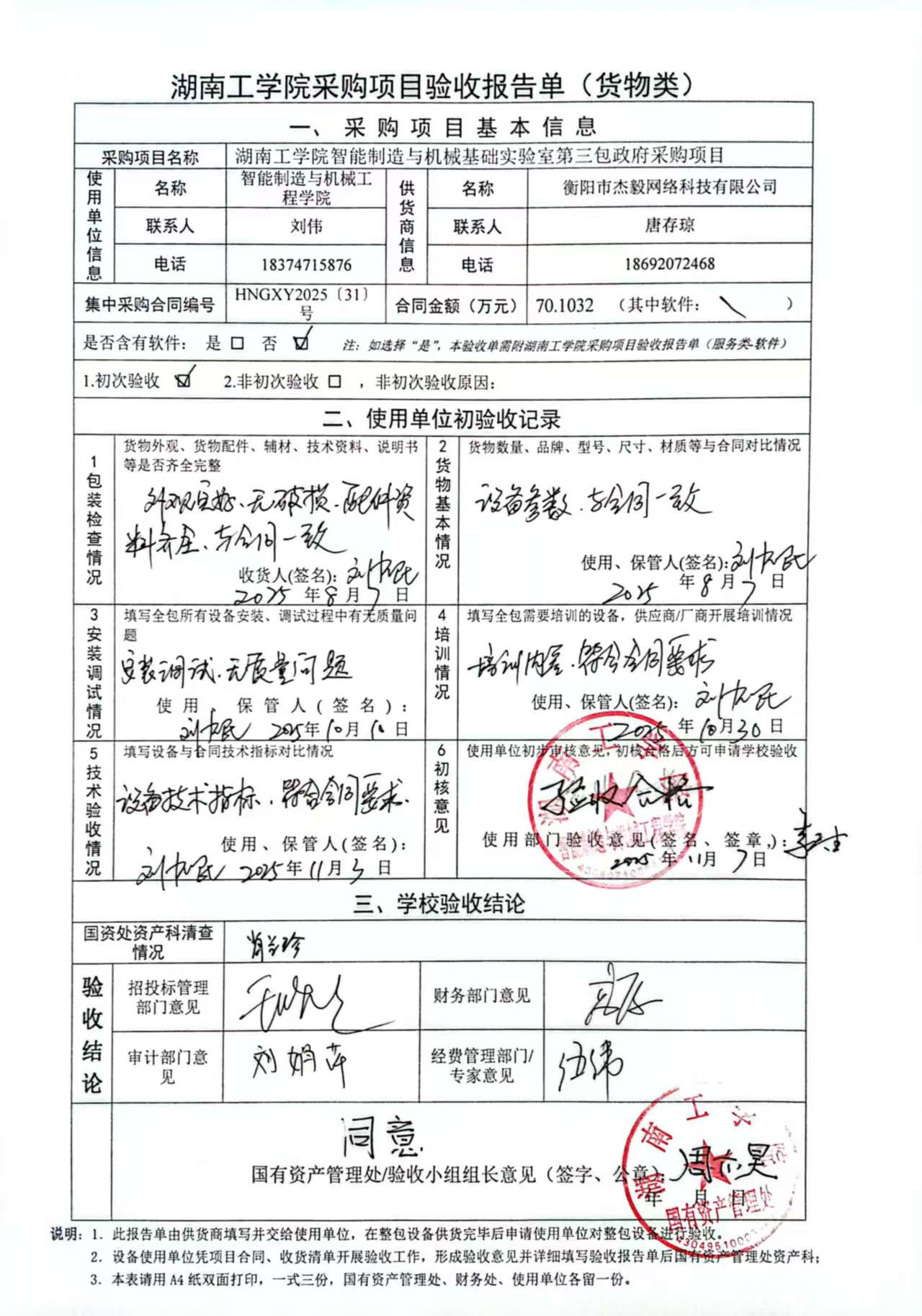 根据国有资产管理处对采购项目的验收安排,2025年11月14日国有资产管理处组织招投标管理与服务中心、审计处、财务处、教务处以及使用部门代表对供应商的项目进行现场验收。