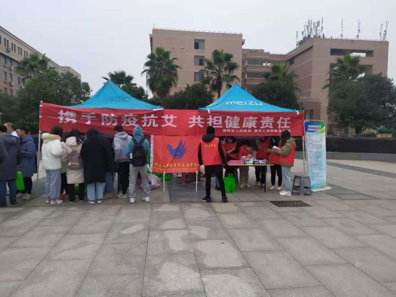 11:00——12:30,医务人员和青年志愿者分成多个小组在各学院大厅、图书馆、食堂、路口等人流比较集中的地方分发艾滋病防控知识手册及安全套,呼吁大家行动起来,携手共同遏制艾滋。