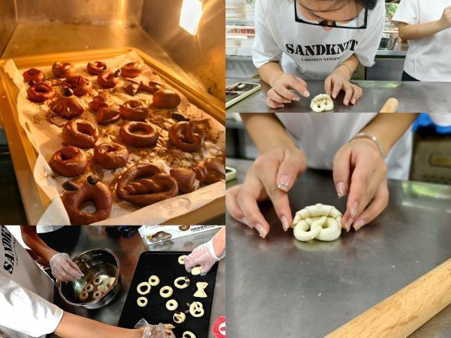 当天上午,大家齐聚手工制作区,开启首场活动——碱水面包挂件DIY。在专业老师的指导下,大家纷纷化身“手作达人”,将普通的面团精心雕琢成小狗、甜甜圈、花朵等可爱造型。制作过程中,所有人互相分享技巧,欢声笑语不断,现场弥漫着烘焙的香气与欢乐的氛围。经过近一小时的努力,一个个精致的碱水面包挂件新鲜出炉,不仅承载着创意与心意,更成为大家情谊的独特见证。