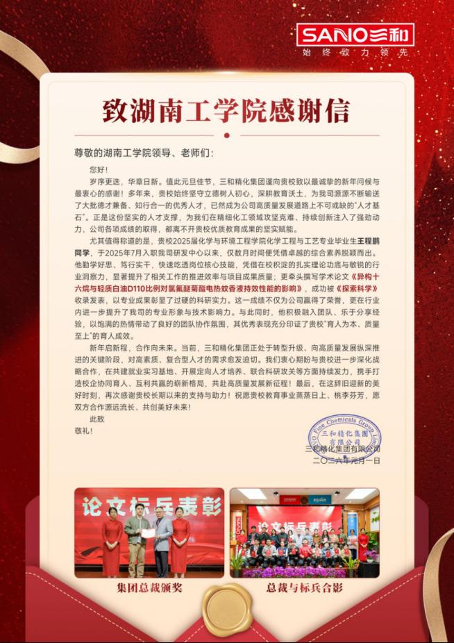 近日,我院收到广东三和精化集团的感谢信,对我院化学工程与工艺专业2025届毕业生王程鹏、陈纪元的工作表现给予高度评价。两名毕业生凭借在校期间积累的扎实理论素养和突出的科研实践能力,入职后迅速融入企业核心岗位,他们的研究成果均被《探索科学》期刊收录发表,展现了个人良好的专业能力,也为企业赢得荣誉。