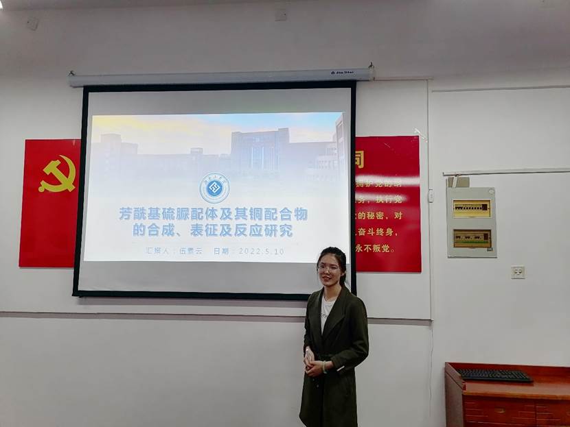 伍素云老师以《芳酰基硫脲配体及其铜配合物的合成、表征与反应研究》为题,主要从研究背景、研究思路等方面讲解了单取代酰基硫脲与双取代酰基硫脲配体与卤化铜的反应,探讨了空间位阻效应对所制备的铜配合物空间构型的影响。