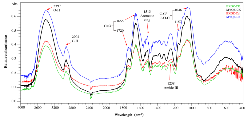 1 茄子高、低镉积累品种在对照和镉处理下根细胞壁傅里叶红外变换光谱分析