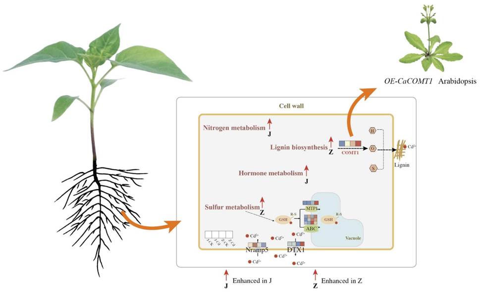 辣椒品种间镉积累差异的分子机制尚不清楚。本研究对高镉(J)和低镉品种(Z)在镉浓度分别为00.4 mg/L的条件下进行了根系转录组比较分析。结果表明,高镉品种通过提高Nramp5的表达来促进根对镉的吸收,并通过增加NIR1GLN1IAA9等基因的表达来消除镉毒性。低镉品种通过增强细胞壁木质素合成基因PALCOMT4CLLACPOD以及镉转运蛋白ABCMTP1DTX1来减少镉积累。在拟南芥中,硫代谢相关基因的表达升高,可能有助于其解毒镉的能力。为了调查CaCOMT1的功能,我们构建了一个拟南芥过表达系(OE-CaCOMT1)。结果表明, OE-CaCOMT1将木质素含量显著提高了3842%,镉向地上部分转运减少了32%。本研究通过转录组分析为辣椒镉积累机制提供了全面的了解。此外,本研究阐明了CaCOMT1的关键功能,为低镉蔬菜的安全生产提供理论依据(图1)。
