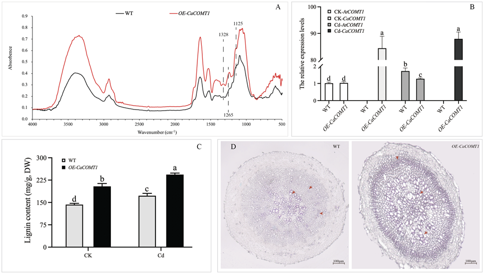 4 对照和镉处理下,野生型和OE-CaCOMT1拟南芥根细胞壁红外光谱分析(A)AtCOMT1CaCOMT1的表达水平(B)、木质素含量(C)和组织化学染色(D)