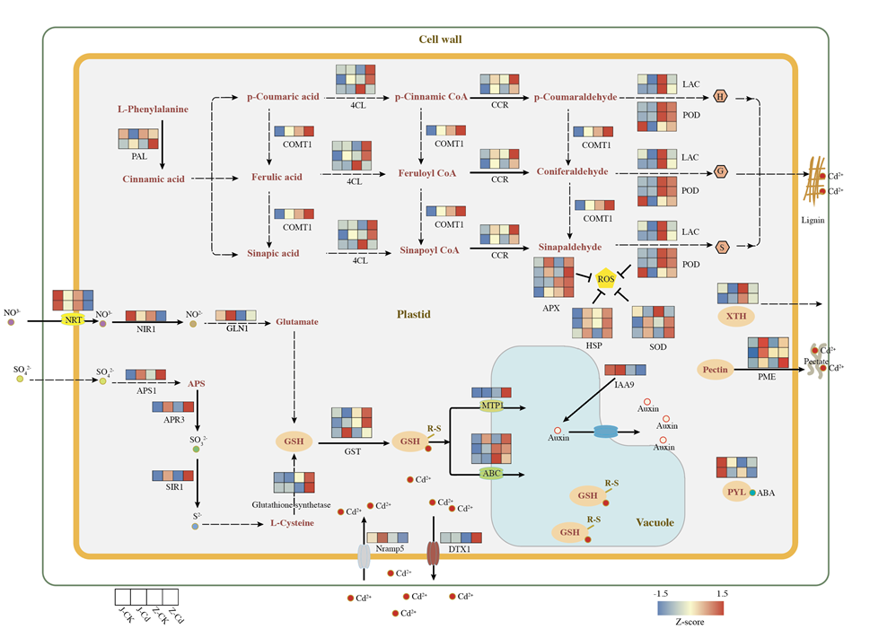 (注:表达热图从左至右依次为J-CKJ-CdZ-CKZ-Cd。每个差异表达基因的表达水平是三个生物样本的平均值,然后进行z-score标准化。)