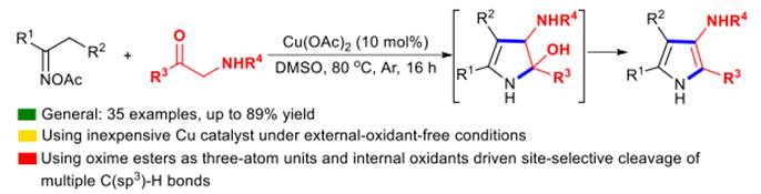 近日,我院刘炎云博士在《Organic Chemistry Frontiers》(中科院一区)发表了题为《Copper-catalyzed oxidative dehydrogenative [3+2] annulation of oximes with α-amino ketones: entry to 3-aminopyrroles》的研究论文。3-氨基吡咯具有抗菌、抗病毒、抗惊厥、抗炎和镇痛等活性,是许多天然产物和FDA批准药物的基本骨架结构(图1)。传统合成3-氨基吡咯的方法反应条件苛刻,需多步合成或特殊预官能化的起始原料,从而限制了产物的结构实用性和多样性。过渡金属催化的环加成反应是合成3-氨基吡咯直接且有效的手段,但相关的报道很少,且往往使用昂贵的IrRhPd催化剂和需对底物进行预官能团化。本文利用易于获得的起始材料和廉价的铜催化剂,直接、简单且高效地合成了多取代3-氨基吡咯,这是利用以往的合成方法所不能合成的。