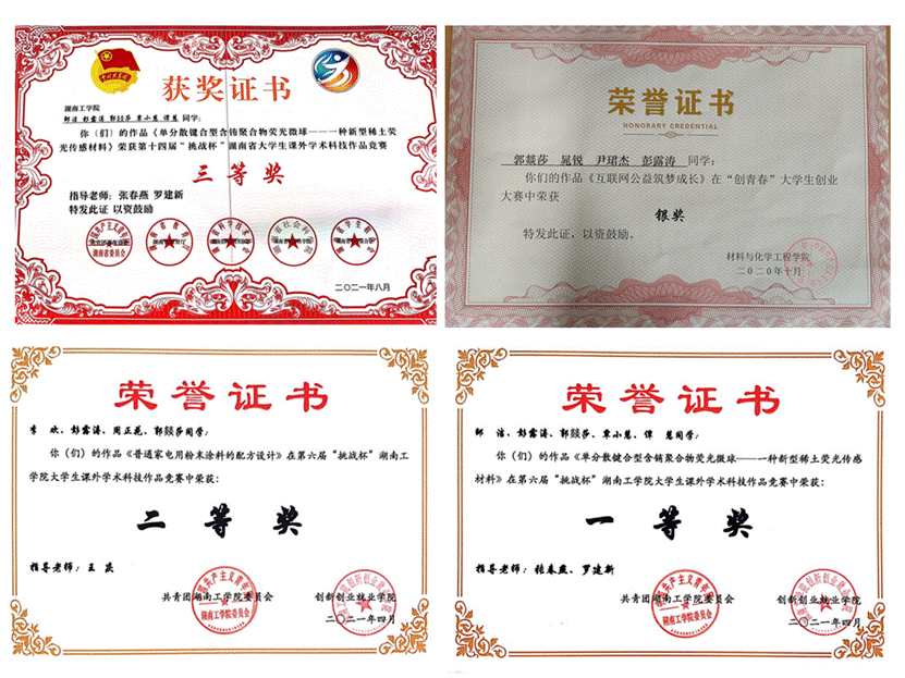 另外,郭燚莎同学积极参加各类竞赛,获得“湖南省第十四届大学生课外学术作品竞赛三等奖”、“挑战杯”大学生课外学术科技作品竞赛二等奖”,参加“创青春”大学生创业大赛获“银奖”,参加材化学院“互联网+”大学生创新创业大赛获“优胜奖”,参加大学生创新创业项目,获校级立项,参加建工学院“互联网+”大学生创新创业大赛师生共创项目获院一等奖,参加304永利集团官网“互联网+”大学生创新创业大赛获红旅赛道校三等奖,参加304永利集团官网第六届“挑战杯”大学生课外学术科技作品竞赛获一等奖、二等奖,参加湖南省第十四届挑战杯大学生课外学术科技作品竞赛获三等奖。